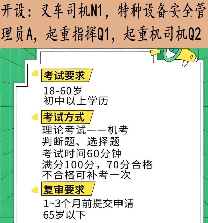 开设:熔化焊接,低压电工,高压电工,高处安装维护拆除,登高架设,制冷与空调,有毒有害有限空间,生产管理人员,生产经营单位负责人,建筑焊工,建筑电工,建筑起重司索信号工,建筑架子工,建筑吊篮,施工员,质量员,材料员,资料员,机械员,劳务员,标准员,建筑员ABC,管道工,防水工,油漆工,变电设备安装工,线路架设工,下水道养护工,装载机,挖掘机,移动式升降工作平台,PC套筒灌浆工,PC构件制作工,PC构件装配工,PC模具工,PC质检工,叉车司机N1 ,特种设备管理员A,起重机指挥Q1,起重机司机Q2,(消防设施操作员(监控/维保),消防管理人员(消防责任人/管理人,动火作业人员(动火审批、监护、操作),保安员