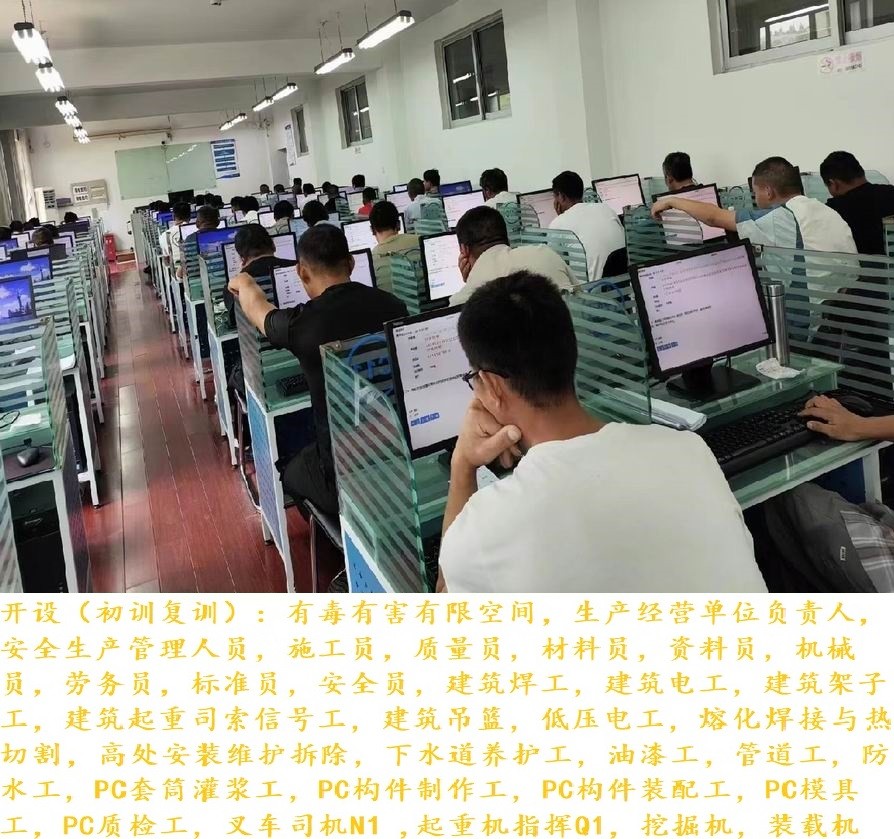 开设:建筑焊工,建筑电工,建筑架子工,建筑起重司索信号工,建筑吊篮,低压电工作业,熔化焊接与热切割,高处安装维护拆除,有毒有害有限空间,生产经营单位负责人,生产管理人员,下水道养护工,油漆工,管道工,通风工,防水工,施工员,质量员,材料员,资料员,机械员,劳务员,标准员,员,PC套筒灌浆工,PC构件制作工,PC构件装配工,PC模具工,PC质检工,叉车司机N1 ,起重机指挥Q1,特种设备管理员A,挖掘机,装载机,移动式升降工作平台(剪叉车+臂车)