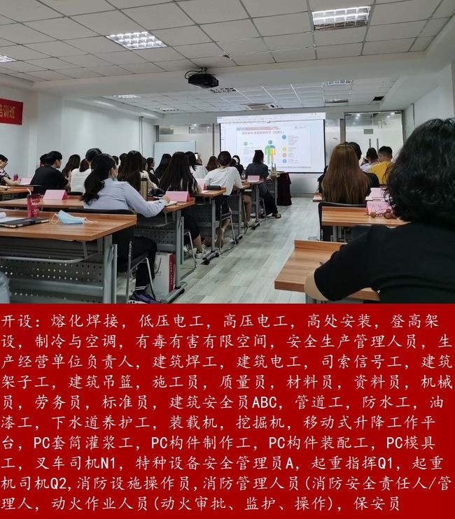 开设:建筑焊工,建筑电工,建筑架子工,建筑起重司索信号工,建筑吊篮,低压电工作业,熔化焊接与热切割,高处安装维护拆除,有毒有害有限空间,生产经营单位负责人,生产管理人员,下水道养护工,油漆工,管道工,通风工,防水工,施工员,质量员,材料员,资料员,机械员,劳务员,标准员,员,PC套筒灌浆工,PC构件制作工,PC构件装配工,PC模具工,PC质检工,叉车司机N1 ,起重机指挥Q1,特种设备管理员A,挖掘机,装载机,移动式升降工作平台(剪叉车+臂车)